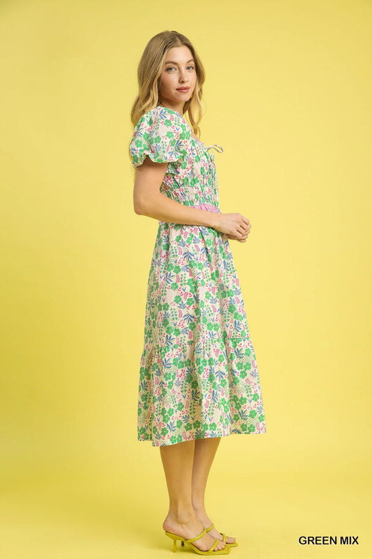 Umgee Puff Sleeve Smocked Waist Midi Dress